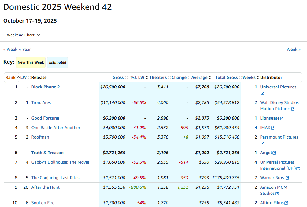 看点网讯www.zlook.com 北美最新周末(10.17-10.19)票房出炉!热门惊悚片续集《黑色电话2》北美首周末票房劲收2650万美元空降冠军(开3411馆)!高于第一部首周末的2363万美元,好于业内预期。北美之外首周末收获1551万美元,同样好于第一部首周末的1350万美元,本片全球首周末票房达4201万美元,制作成本3000万美元。伊桑·霍克、梅森·泰晤士、玛德琳·麦格劳回归出演。