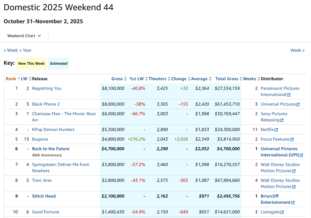 Netflix电影《Kpop猎魔女团》再次限定重返大银幕,万圣节周末票房再收530万美元,北美累计票房达到2430万美元。该片上一次在北美限定上映周末票房劲收1920万美元空降冠军,成为Netflix史上首部票房榜夺冠的影片!