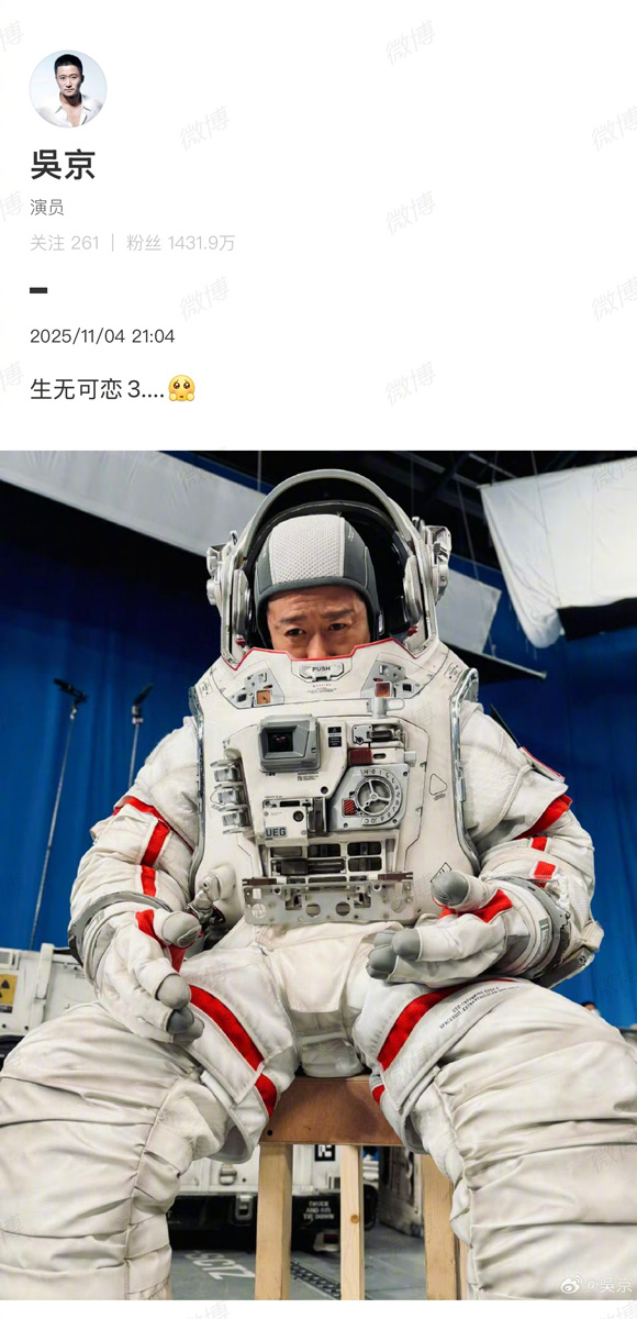 看点网讯www.zlook.com “生无可恋3……”11月4日晚,吴京在微博上发出的这五个字,配上他身穿宇航服瘫坐在椅子上的表情,立刻引发粉丝热议。