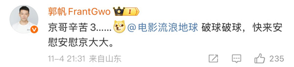 这已是《流浪地球》系列的经典梗,吴京的“刘培强表情包”成了这个系列电影的另类彩蛋。导演郭帆火速互动回应:“京哥辛苦3……@电影流浪地球 破球破球,快来安慰安慰京大大。”