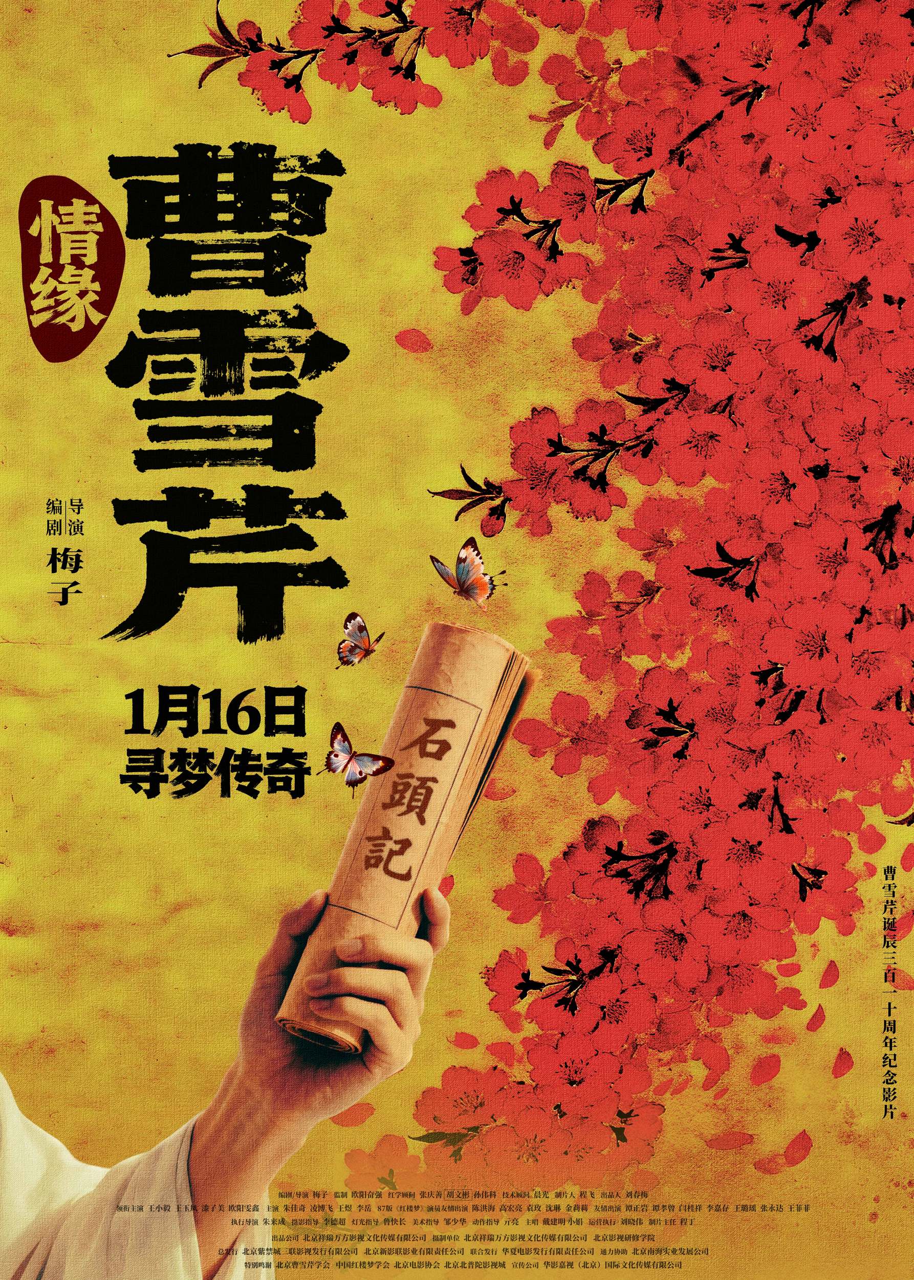 比起以往聚焦红楼幻境的改编,《情缘曹雪芹》将镜头对准了作者本人。影片以曹雪芹的生命轨迹为线索,从他幼时与玉石结缘的懵懂,到中年伏案疾书的执着,通过他与芳青、荷香、云妹三位女性的情感交织,还原出“为闺阁增光”的创作初心。定档海报里,未露正脸的曹雪芹立于如雪花瓣中,手持《石头记》书卷,彩蝶绕身而过,东方诗画的意境里,藏着他对人间情爱的细腻感知——那些红楼女儿的悲欢,原来都源于他生命中真实的温暖与遗憾。