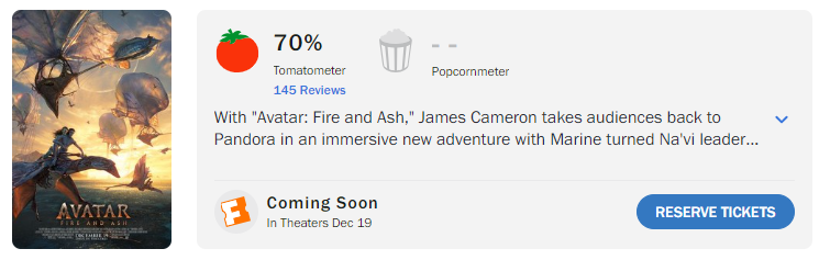 看点网讯www.zlook.com 备受瞩目的科幻史诗巨制《阿凡达3》媒体口碑已全面解禁。与影迷们长达数年的翘首以盼相比,这份答卷似乎透着一丝寒意。截至目前,该片在烂番茄的新鲜度维持在68%-71%区间(目前收录约145条评论),MTC综合评分61分。这一成绩不仅远逊于系列开山之作《阿凡达》(烂番茄81%/MTC 83),也略低于前作《阿凡达2:水之道》(烂番茄76%/MTC 67)。在口碑两极分化的声浪中,那个曾经用技术革新定义时代的潘多拉星球,似乎正面临着前所未有的“审美疲劳”危机。