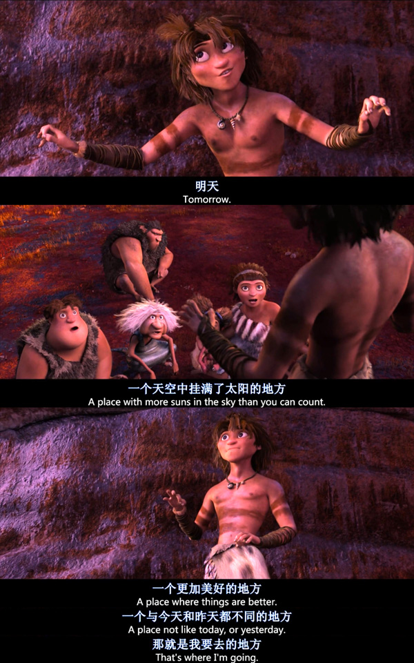 赏析:这是电影最美丽的设定之一。在咕噜家族的认知里,只有“昨天”和“今天”,“明天”是一个虚幻的概念。而盖告诉他们,“明天”是一个可以抵达的、充满希望的具体之地。这句台词是人类乐观精神与进取心的终极体现。它象征着我们不应被过去的经验完全束缚,要有勇气相信并走向一个更美好的未来。它鼓励我们将希望具象化,并为之前进。