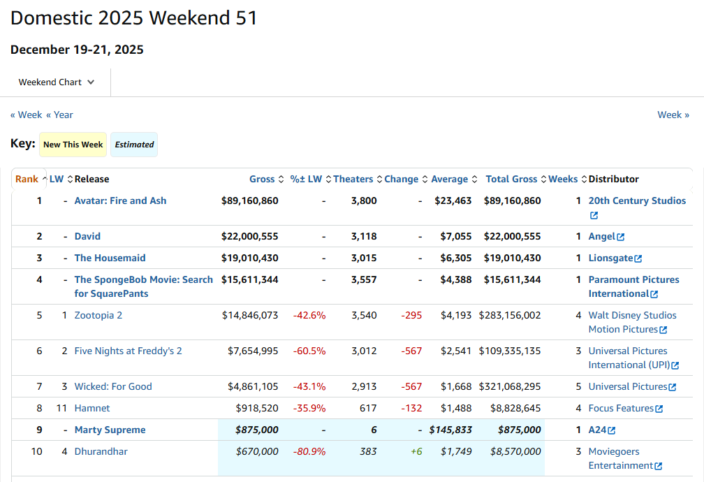 “甜茶”提莫西·查拉梅制作并主演A24冲奥新片《至尊马蒂》北美首周末6馆点映票房高达87.5万美元,平均单馆票房高达14.58万美元,创下A24影片点映单馆平均票房历史新高,也是自2016年《爱乐之城》获得17.6万美元平均单馆点映票房以来的最高平均单馆票房。该片圣诞节12.25当天正式在北美大规模上映,预计开2500馆左右。