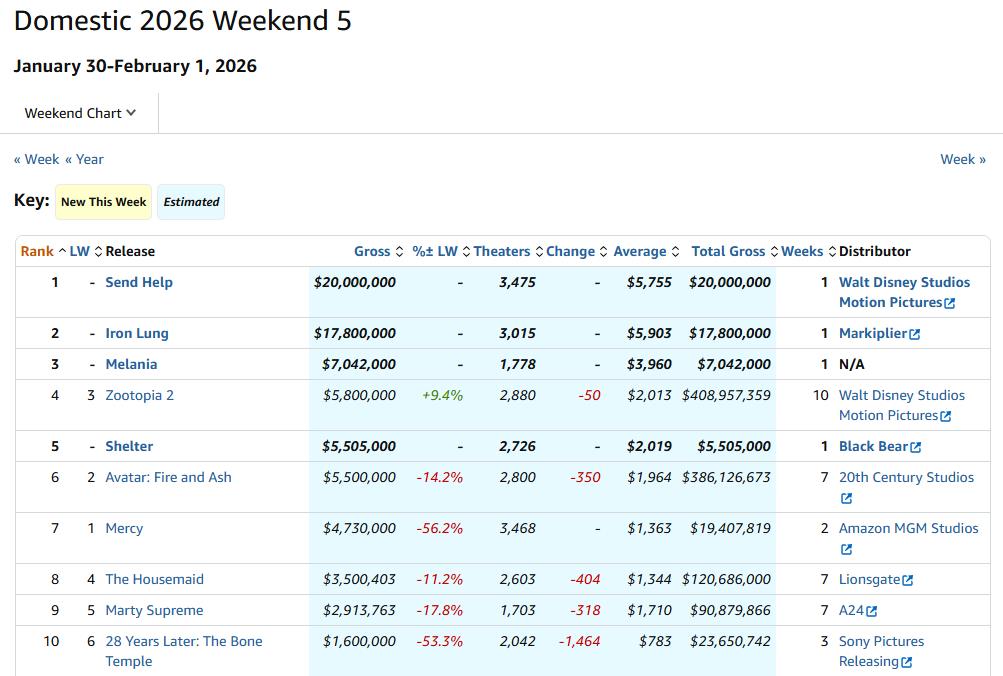 这股增长动力主要来自四部同日上映的新片冲入票房前十,其中《荒岛囚救》和《铁肺》更是成为本周仅有的两部周末票房突破千万美元的电影。