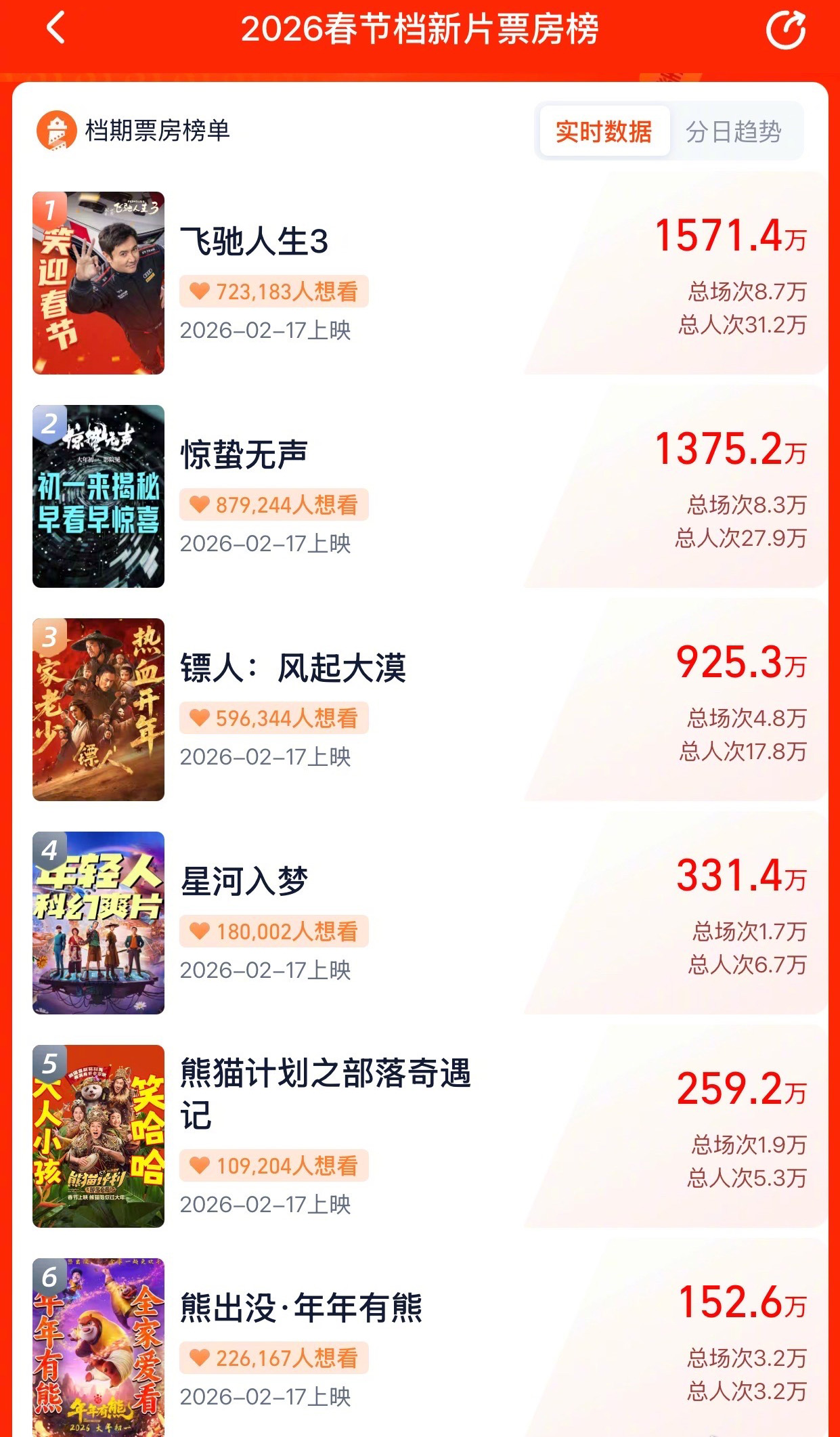 据凤凰资讯分析,各片的核心受众差异显著:《惊蛰无声》 更吸引年轻及女性观众;《镖人:风起大漠》 则偏向吸引男性观众;而《熊出没·年年有熊》 作为历年春节档的“常驻嘉宾”,在三四线城市拥有断层领先的想看占比,体现了其稳固的合家欢属性。