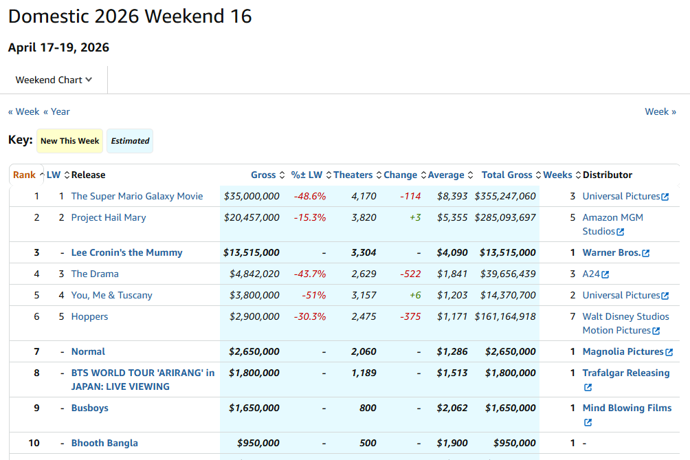 看点网讯www.zlook.com 刚刚过去的这个周末,北美电影市场再次被两部风格迥异的影片统治。一边是合家欢动画续集《超级马力欧银河大电影》继续稳坐冠军宝座,一边是硬核科幻《挽救计划》展现出惊人的长尾耐力。而A24的两部新片,则呈现出一冷一热的微妙局面。