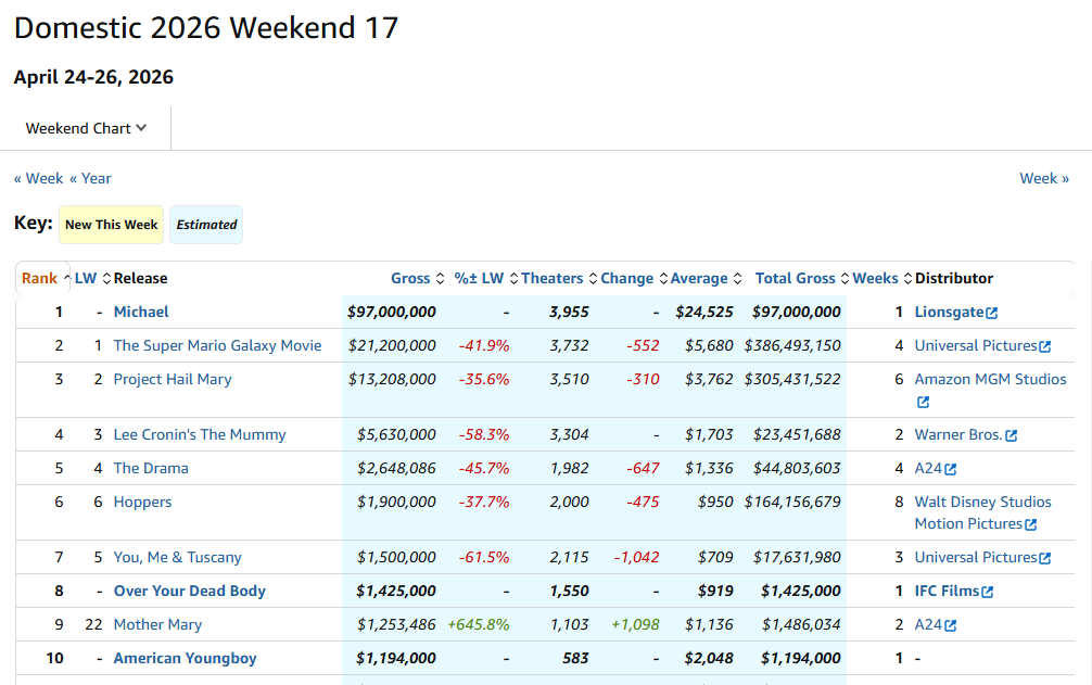 看点网讯www.zlook.com 北美最新周末(4.24-4.26)票房出炉!迈克尔·杰克逊传记片《迈克尔·杰克逊:巨星之路》北美首周三天粗报9700万美元夺冠,北美之外82个市场1.203亿美元开画,包括中国内地首周三天3260万元。全球首周票房约2.173亿美元,大幅超出预期,超过《奥本海默》(9800万美元)和《波西米亚狂想曲》(9170万美元),创造传记片海外首周末票房最高纪录!